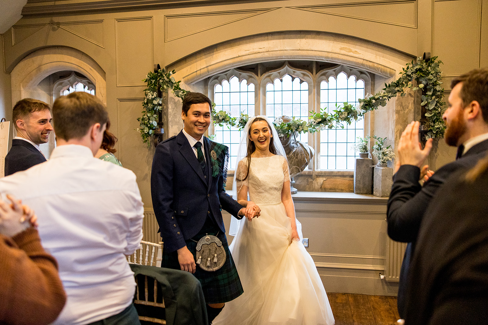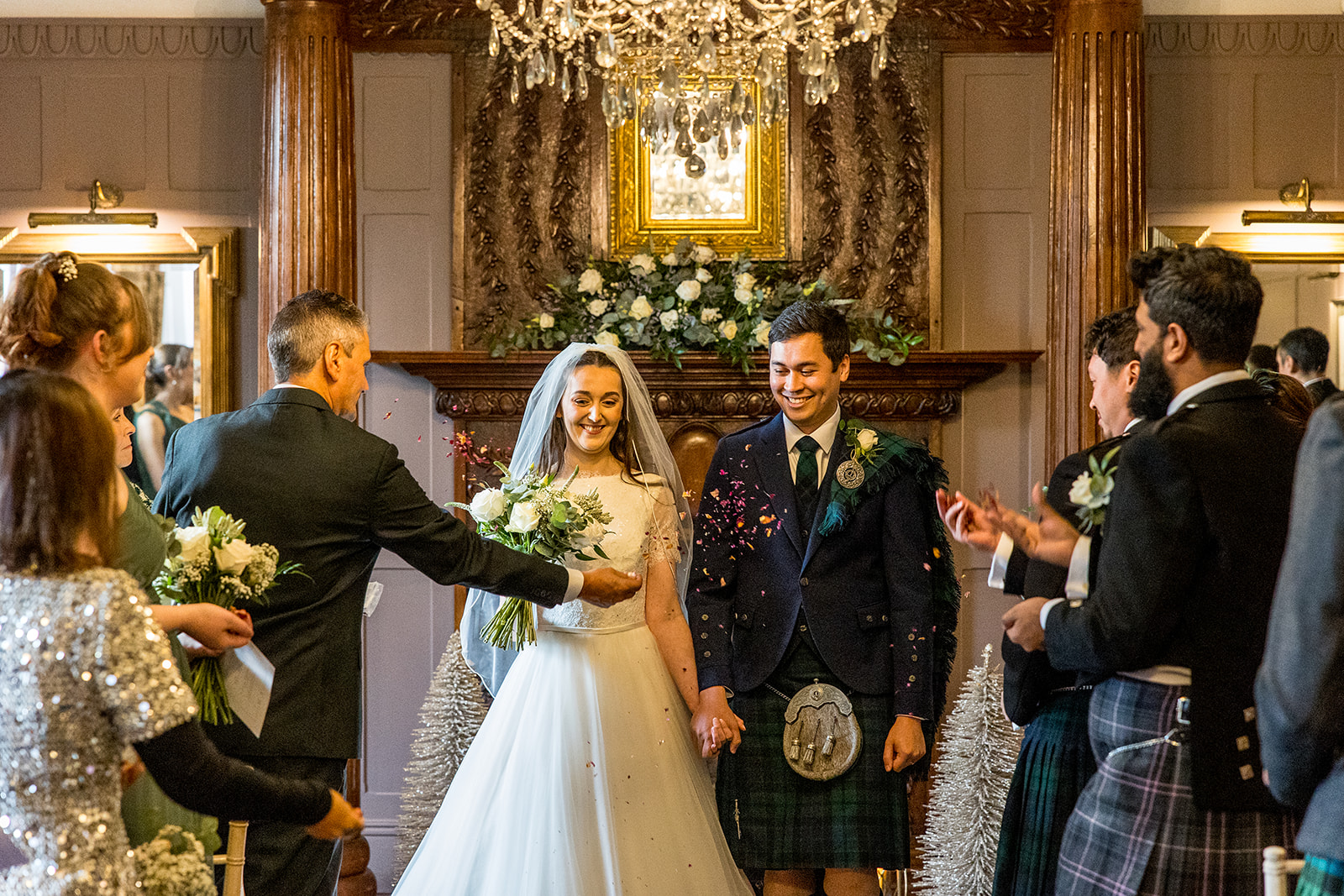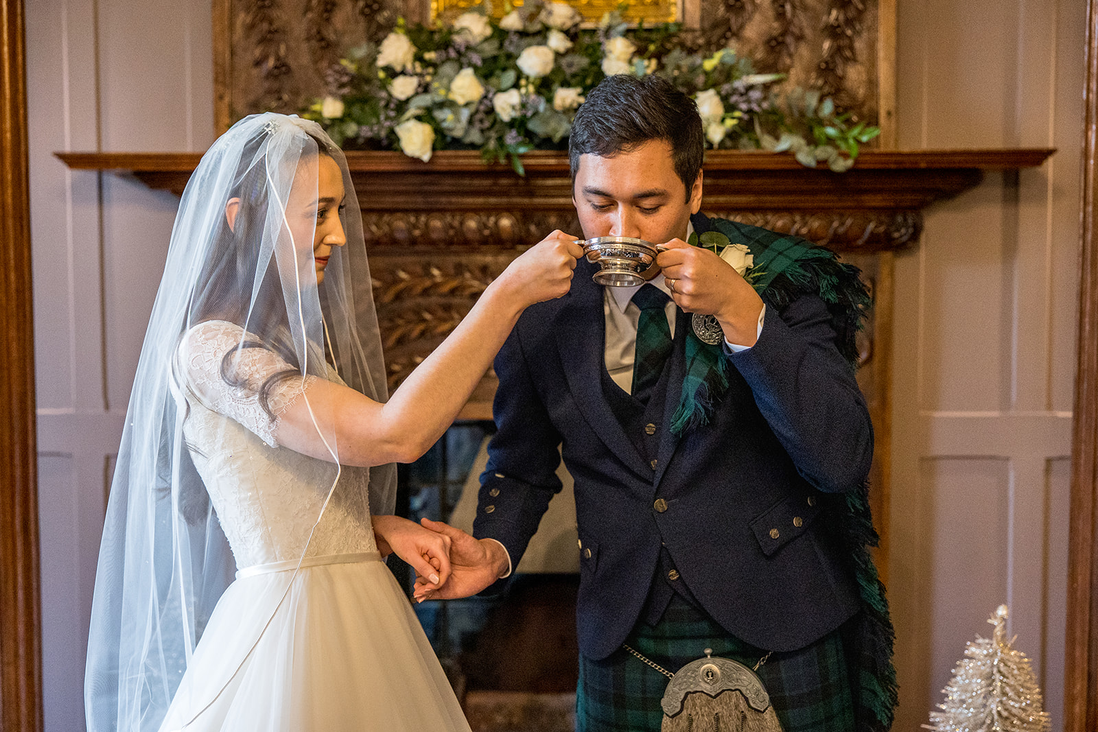 As Will is from Scotland it was always going to be part of our day. Naturally Will and his wedding party wore tartan kilts, and our florals incorporated thistles, white Eustoma and native foliage’s. We chose a Quaich ceremony, where you use a two-handled cup as a union of the two clans. It marks your family’s coming together, which we wanted to celebrate. It really fitted in with what we had planned at Ellingham Hall. The registrar couldn’t be involved in this part as it includes alcohol, so the team at Ellingham planned this part for us. It was incorporated after our legal ceremony and speaks volumes for the Ellingham team as they delivered it all seamlessly.
